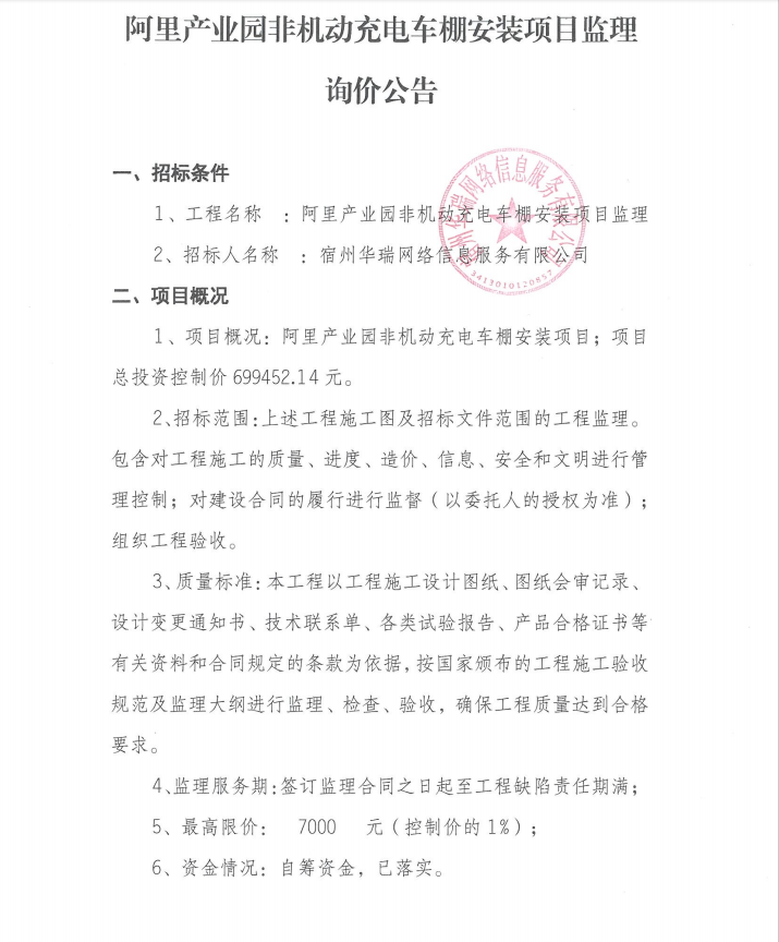 阿里產(chǎn)業(yè)園非機(jī)動(dòng)充電車(chē)棚安裝項(xiàng)目監(jiān)理詢價(jià)公告